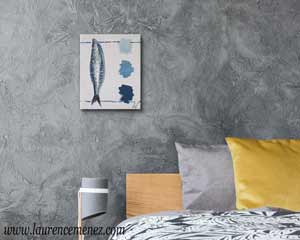- Tableau en peinture à l'huile représentant 1 sardine sur un fond blanc.