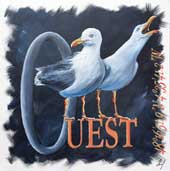 - Tableau en peinture à l'huile représentant 2 goélands sur fond gris dégradé, inscription "OUEST" orangée et position gps.
